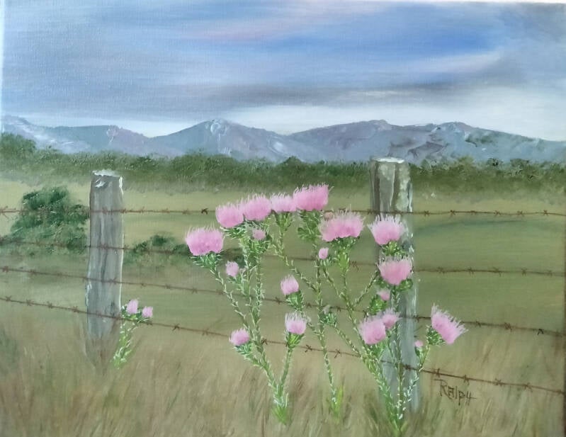 Fence and Thistles Oil on Canvas 11hX14w, Giclees available